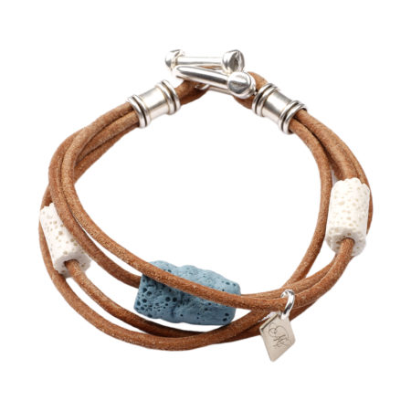 Ανδρικό βραχιόλι χειροποίητο φτιαγμένο από δέρμα με ημιπολύτιμους λίθους Λάβα και επάργυρα...